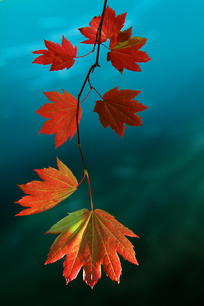 A delicate vine maple branch overhangs the Ohanapecosh River in Washington’s Mount Rainier National Park.