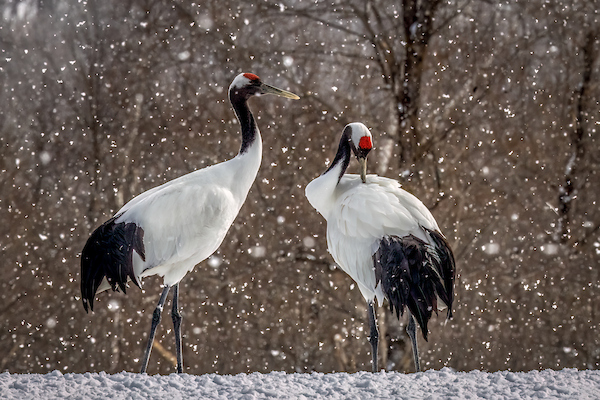 The red-crowned crane is one of Japan’s most charismatic and emblematic animals. At approximately four feet tall, the cranes dance, jump, and chase one another in a poetic courtship display of great importance since they mate for life; their exuberant calls ring throughout the mountain valleys. Once found throughout Asia, Japanese cranes are now endangered. However, recent efforts to maintain a habitat in Hokkaido have produced a comeback and offer hope for the cranes’ survival in Japan